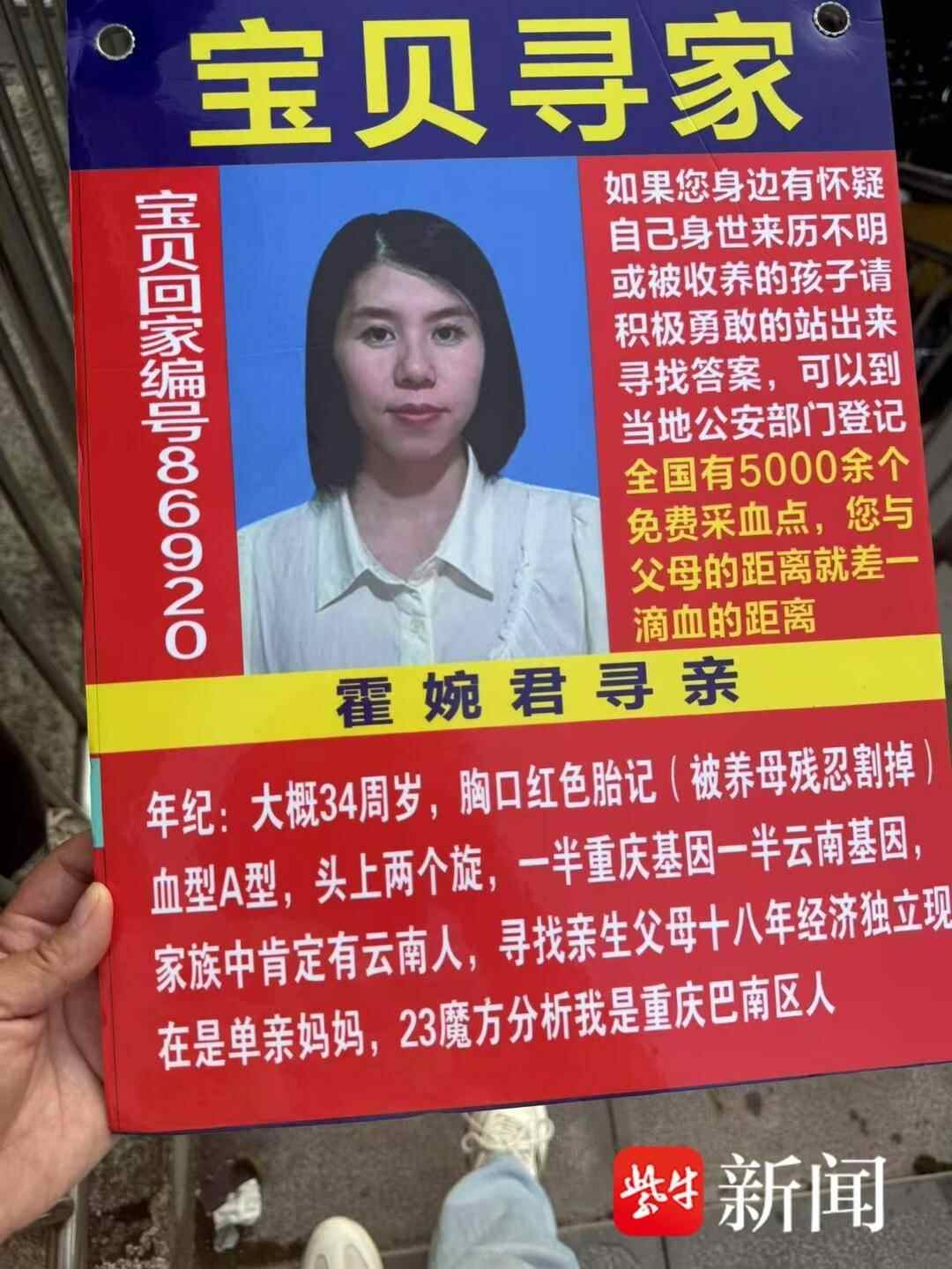 为了寻找亲生父母,霍婉君这些年来想尽了办法。2012年,她采血登记DNA信息。2014年,她在宝贝回家做了登记。