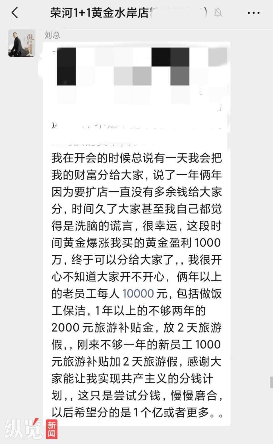 根据多名网友发布的视频中一张微信截图显示,一名名称备注为“刘总”的网友在多个微信群里发布信息称:我在开会的时候总说有一天我会把我的财富分给大家,说了一两年因为要扩店一直没有多余钱给大家分,时间久了大家甚至我自己都觉得是洗脑的谎言,很幸运,这段时间黄金暴涨我买的黄金盈利1000万,终于可以分给大家了……截图中还公布了“分钱”标准,两年以上员工每人分10000元,包括做饭工和保洁;一年以上的不够两年的分2000元旅游补贴金,放2天旅游假;刚来不够一年的新员工1000元旅游补贴加2天旅游假。