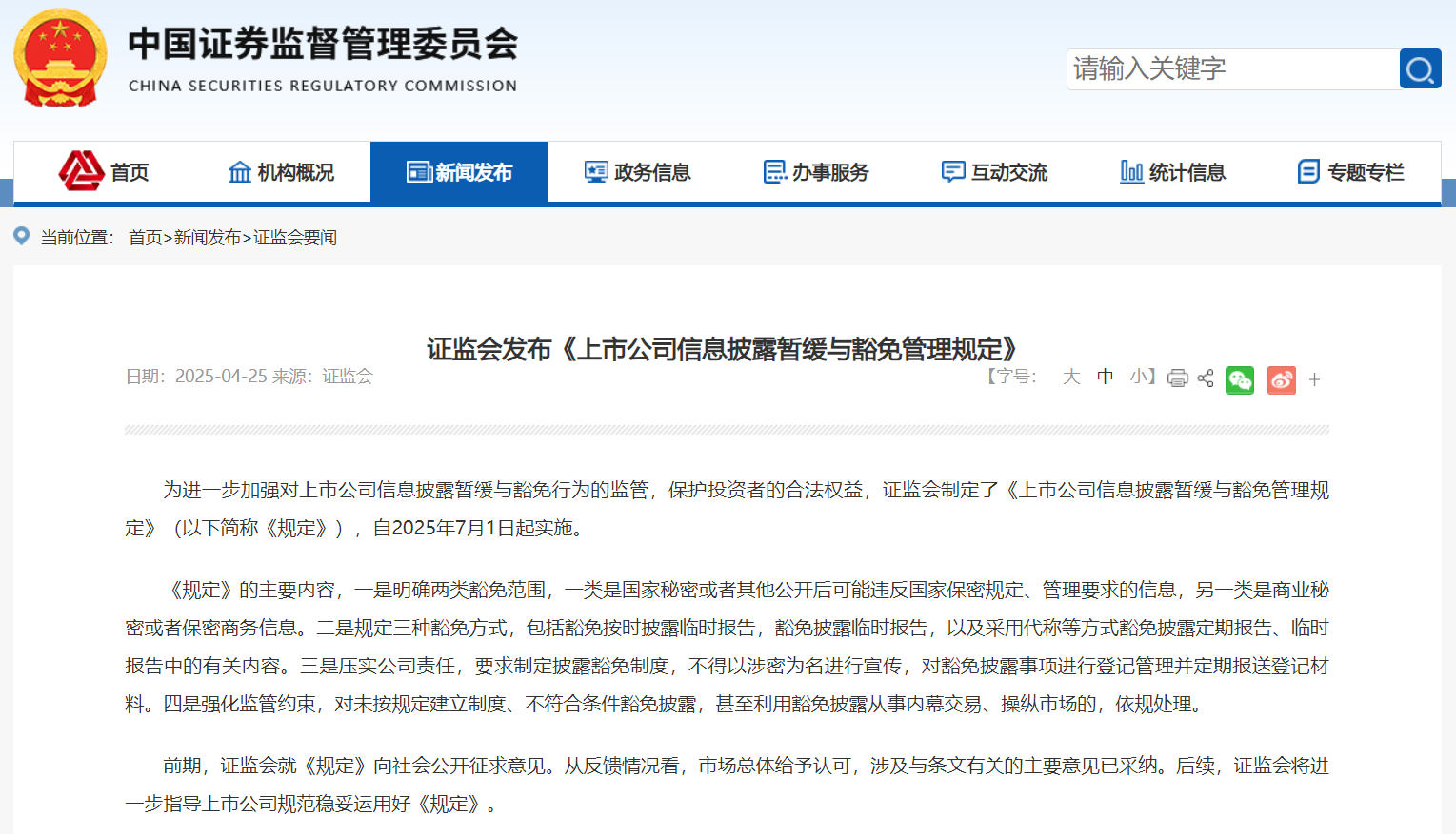 据证监会消息,为进一步加强对上市公司信息披露暂缓与豁免行为的监管,保护投资者的合法权益,证监会制定了《上市公司信息披露暂缓与豁免管理规定》(以下简称《规定》),自2025年7月1日起实施。