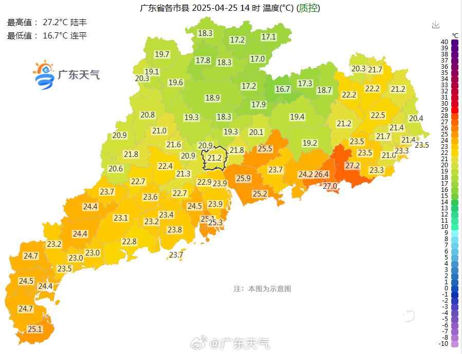 昨天(4月25日)14时,广东全省气温介于16.7~27.2℃,全省气温较前一日都有不同程度的下降,其中南海、三水、花都、从化、新丰、东源、紫金、龙川和五华降温达10℃以上,广州同比也下降了近10℃,有一种夏天紧急撤退的感觉?