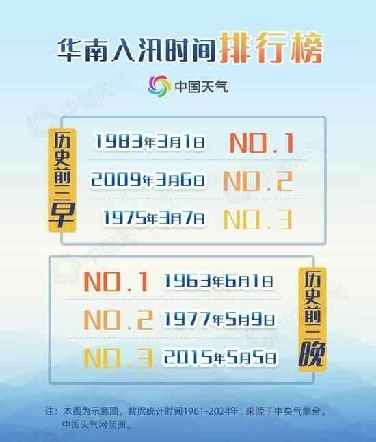 统计了1961年至2024年的大数据发现,今年华南前汛期开启时间虽偏晚,但还不算最晚的。历史上,1963年华南前汛期开启时间最晚,6月1日才姗姗来迟;1983年最早,在3月1日就早早到来。