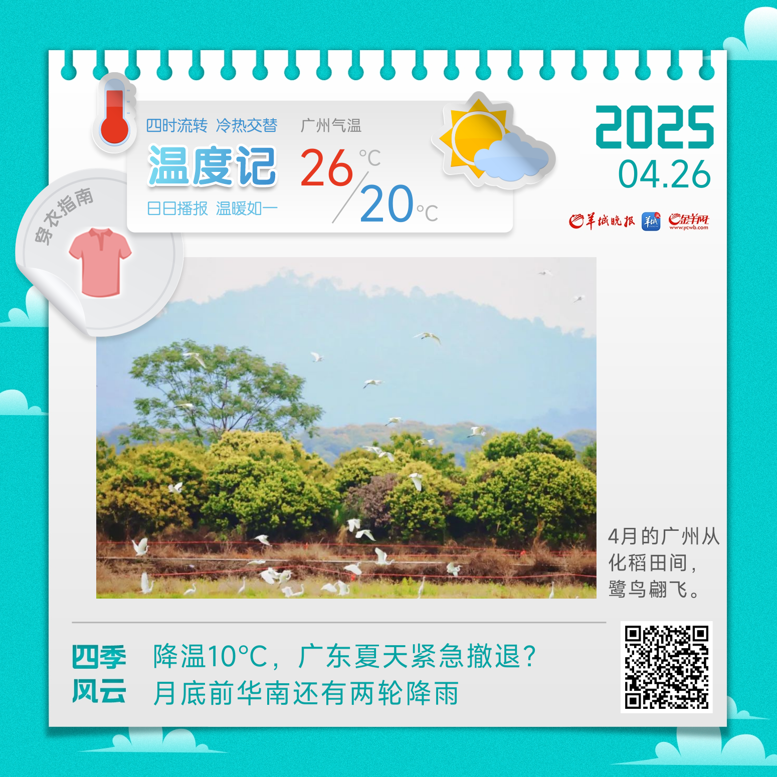 26日,韶关、清远和珠江三角洲阴天到多云,有阵雨局部大雨,其余市县多云到阴天,有分散阵雨。大部市县早晚有轻雾,白天最高气温将介于25~29℃。
