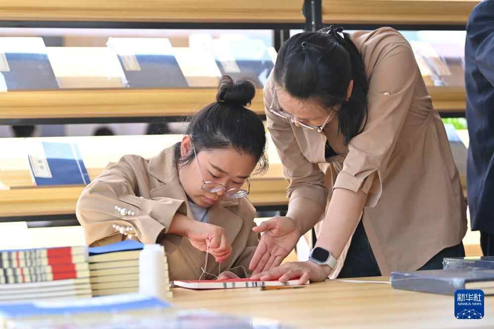 4月23日,在山西太原,读者在第四届全民阅读大会龙城书展上体验线装书缝制。