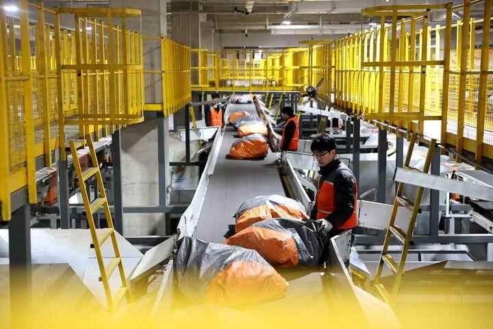 工人在河北省固安县的申通快递华北转运中心内工作(2025年2月26日摄)。新华社记者 王晓 摄