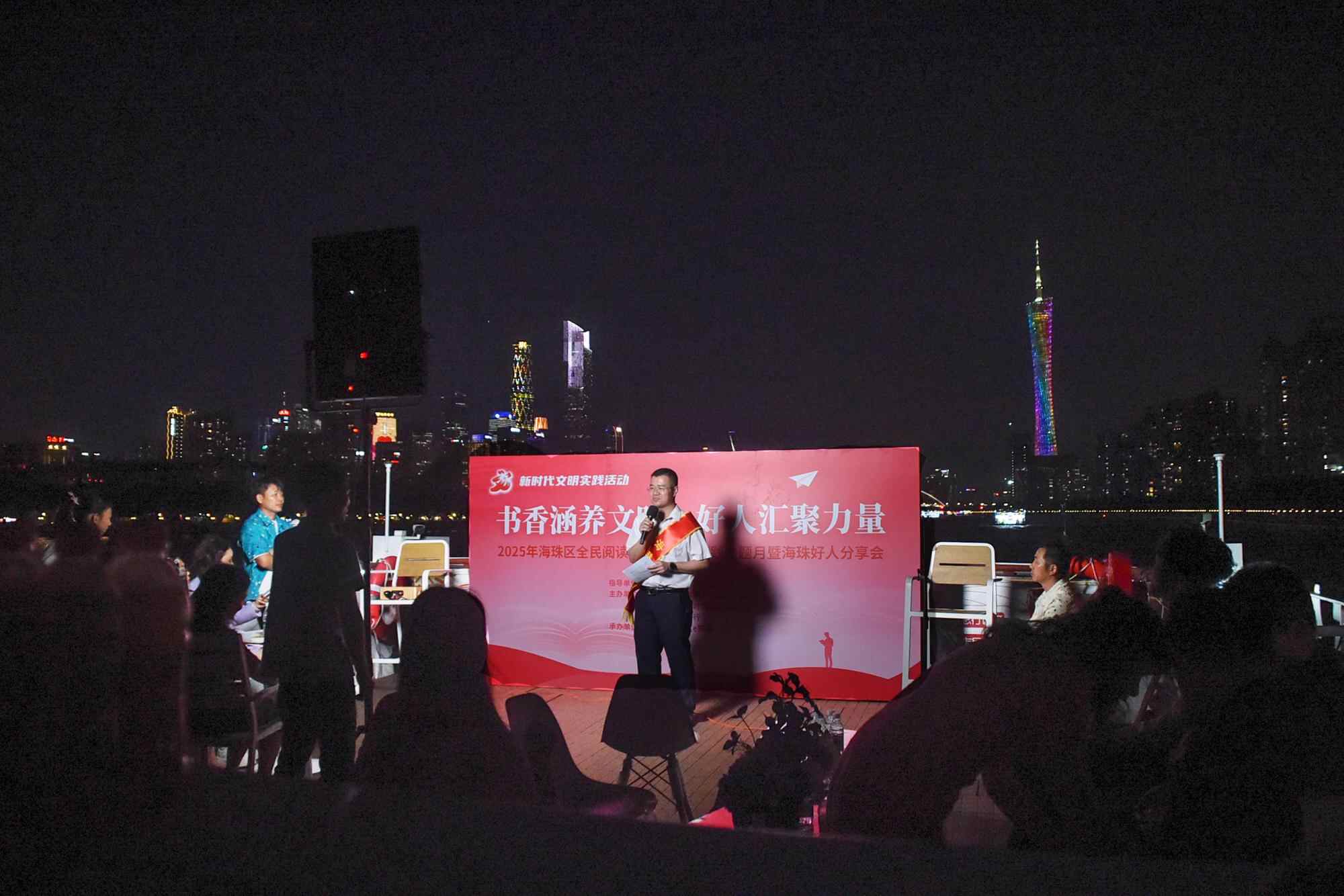 近日,伴随着悠悠的珠江水,一艘满载着琅琅读书声的珠江游轮从中大码头缓缓驶向广州塔,2025广州市海珠区全民阅读新时代文明实践主题月暨“海珠好人”分享会活动在此拉开帷幕。