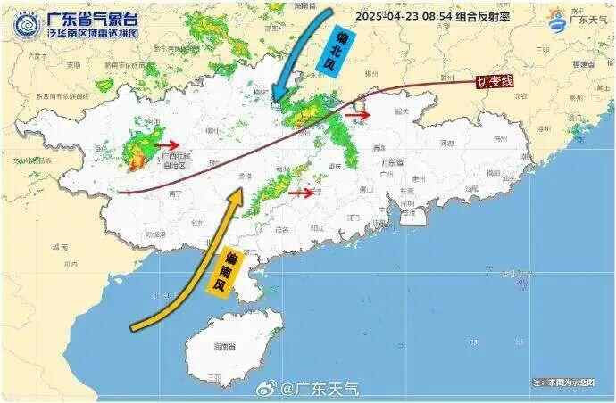 从雷达图可见,昨天切变线(冷暖气流交汇)位于华南北部,广西境内有雷雨云团生成并逐渐东传,粤北和珠三角北部的雷雨比较活跃。