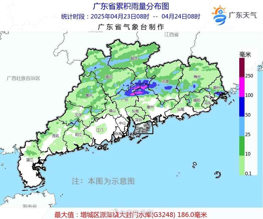 据气象水文监测,04月23日08时到24日08时,全省平均雨量8.3毫米,有13个镇街录得超过100毫米的大暴雨,有41个镇街录得50毫米~100毫米的暴雨。各市雨量最大的镇街有:广州增城区派潭镇186毫米、惠州龙门县永汉镇145.9毫米、潮州饶平县汫洲镇110.2毫米、汕头澄海区东里镇104.3毫米、韶关新丰县丰城街道102.1毫米。