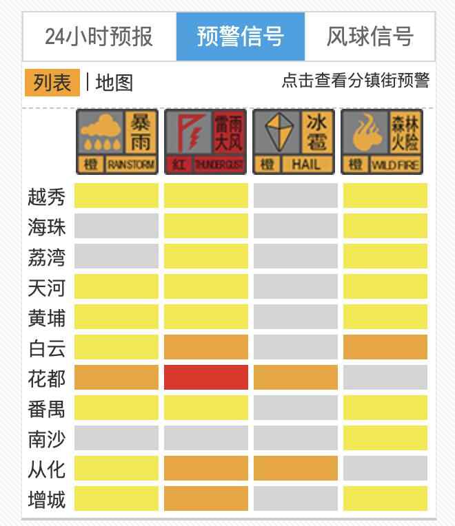 截至24日15时35分。广州多区已经发布“风雨预警”信号。除越秀天河外,花都发布了雷雨大风橙色、冰雹橙色、暴雨黄色预警。白云发布雷雨大风黄色预警。从化,增城发布雷雨大风和暴雨黄色预警信号。随着雨势发展,不排除广州其他各区陆续发布和调整预警信号。