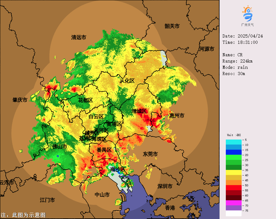 @广州天气预计24-25日有明显降水并伴强对流天气,气温小幅下降,其中:24日午后雷雨趋明显,北部转大到暴雨,中南部转中到大雨;24日夜间-25日夜间,有大到暴雨局部大暴雨。