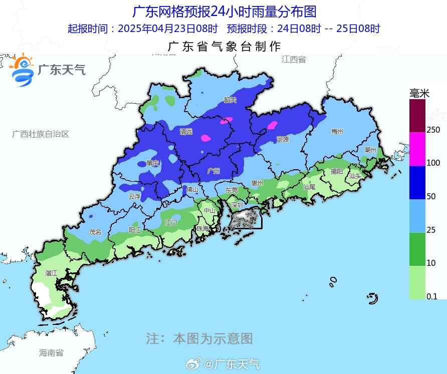 @广东天气预计今天(24日),粤北、珠江三角洲有暴雨局部大暴雨,粤东市县有大雨,其余市县有分散(雷)阵雨局部大雨。