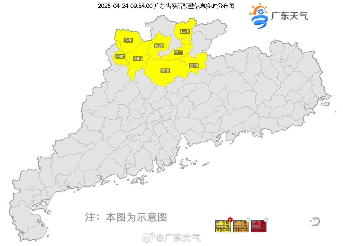 截至24日9时54分,连南、连州、阳山、乳源、英德、翁源、曲江、仁化暴雨黄色预警生效中,怀集、阳山雷雨大风黄色预警生效,出行注意交通安全,遇到积水路段尽量绕行,切勿强行涉水。
