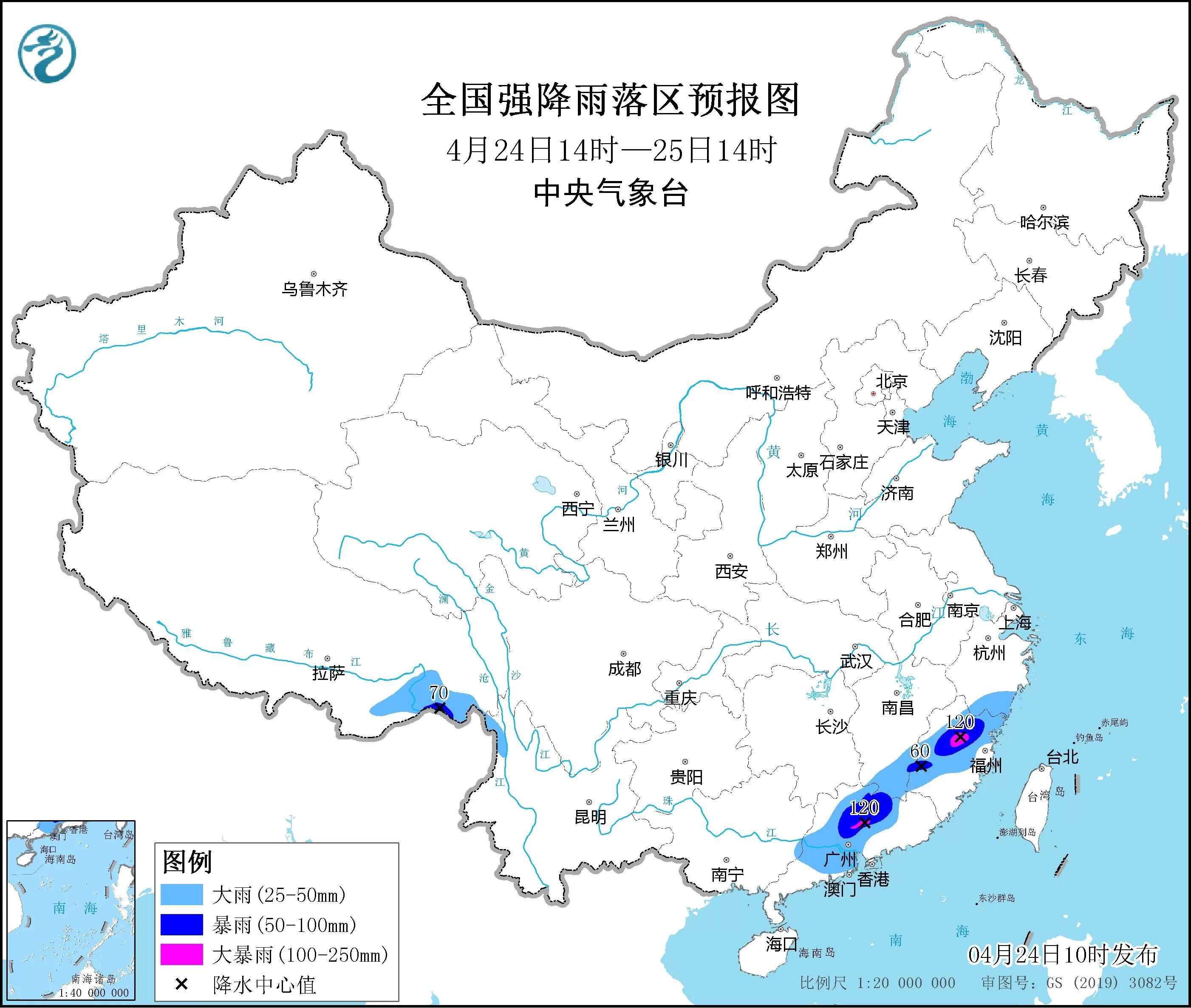 中央气象台4月24日10时继续发布暴雨蓝色预警:预计,4月24日14时至25日14时,广东中北部和珠三角地区、福建西南部和中北部、江西南部、浙江南部以及西藏东南部、云南西北部等地部分地区有大到暴雨,其中,福建中北部、广东中部等地局地有大暴雨(100~120毫米);上述部分地区伴有短时强降水(最大小时降雨量20~50毫米,局地可超过60毫米),局地有雷暴大风等强对流天气。
