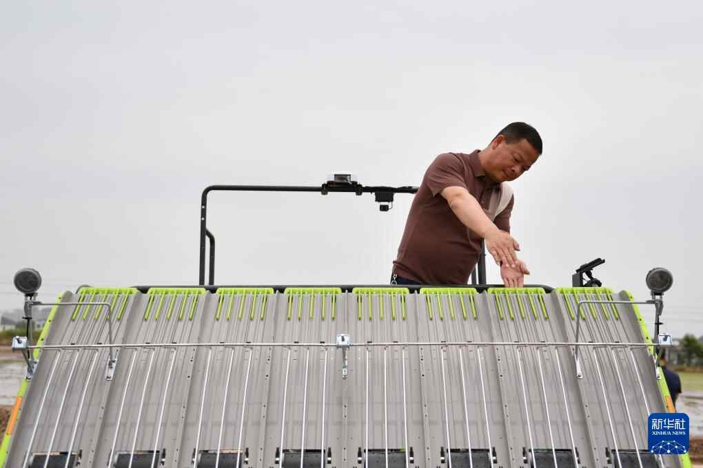 4月23日,种粮大户在湖南省益阳市南县南洲镇班嘴村查看无人驾驶插秧机装载的智能设备。
