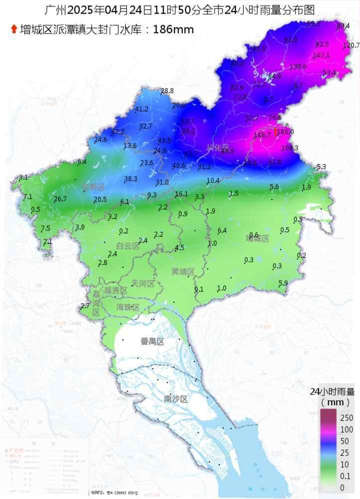 广东省气象部门观测统计,23日到24日早晨,珠三角北部出现了大到暴雨局部大暴雨,粤北和粤东部分市县出现了中到大雨局部暴雨,其余市县出现了分散雷阵雨,据气象水文监测,23日8时到24日8时,全省有13个镇街录得超过100毫米的大暴雨,有41个镇街录得50毫米~100毫米的暴雨,各市雨量最大的镇街有:广州增城区派潭镇186毫米、潮州饶平县汫洲镇110.2毫米、韶关新丰县丰城街道102.1毫米。