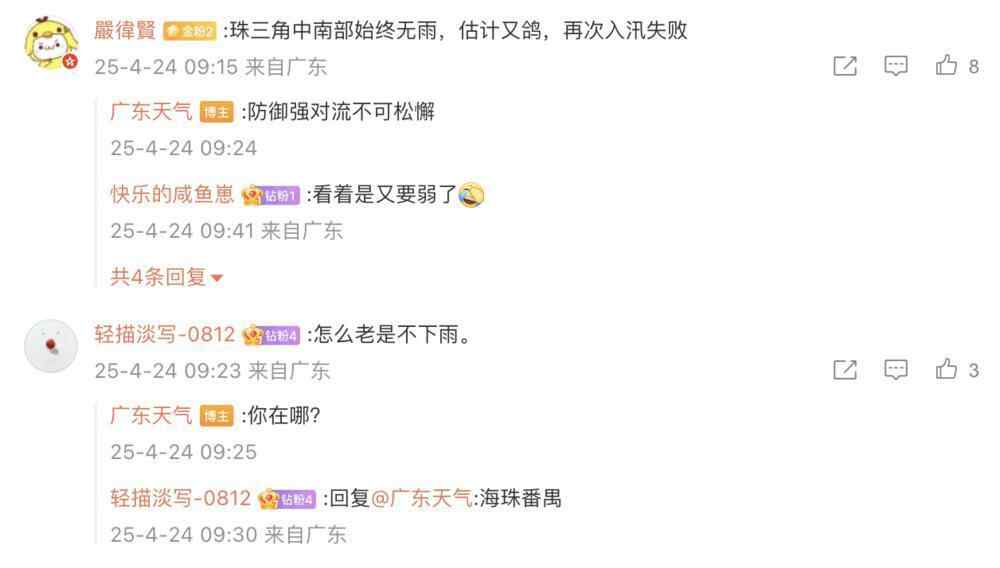 由于降水暂时“北多南少”,有部分网友在新浪微博“@广东天气”评论区留言,询问后续天气形势。广东省气象部门提醒,暂无降水地区莫大意,防暴雨防强对流不可松懈。
