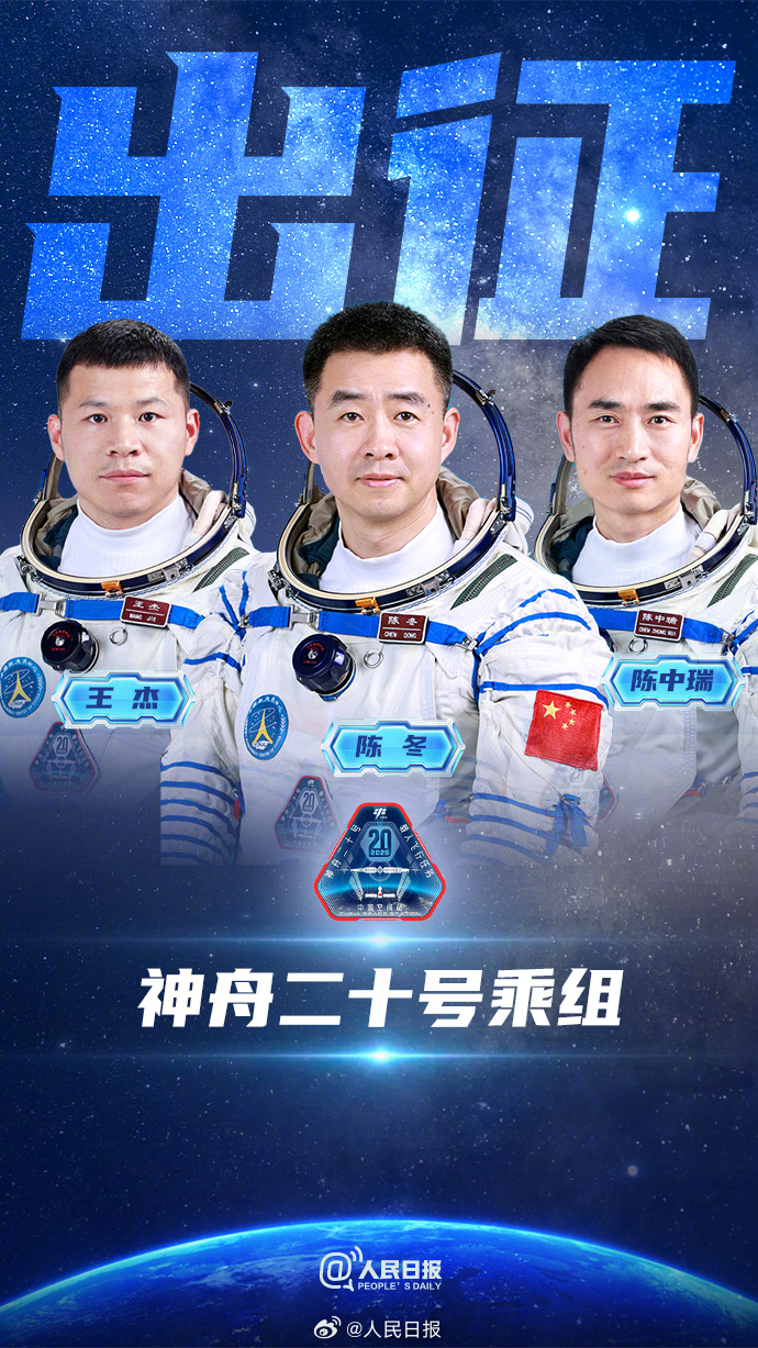 据中国载人航天工程办公室消息,北京时间2025年4月24日14时25分,神舟二十号载人飞行任务航天员乘组出征仪式在酒泉卫星发射中心问天阁圆梦园广场举行。14时26分,中国载人航天工程总指挥、空间站应用与发展阶段飞行任务总指挥部总指挥长许学强下达“出发”命令,陈冬、陈中瑞、王杰3名航天员在第十个“中国航天日”当天领命出征。目前,神舟十九号航天员乘组进驻空间站近六个月,正在积极准备迎接即将到来的神舟二十号航天员乘组。