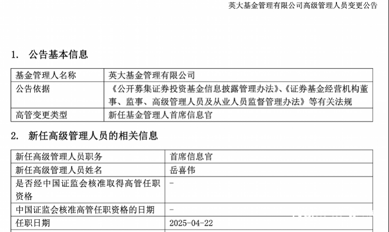 4月24日,英大基金管理有限公司(以下简称“英大基金”)发布公告,宣布任命岳喜伟为首席信息官(CIO),任职自2025年4月22日起生效。英大基金表示,此次任职变动属于职务兼任,不涉及离任。