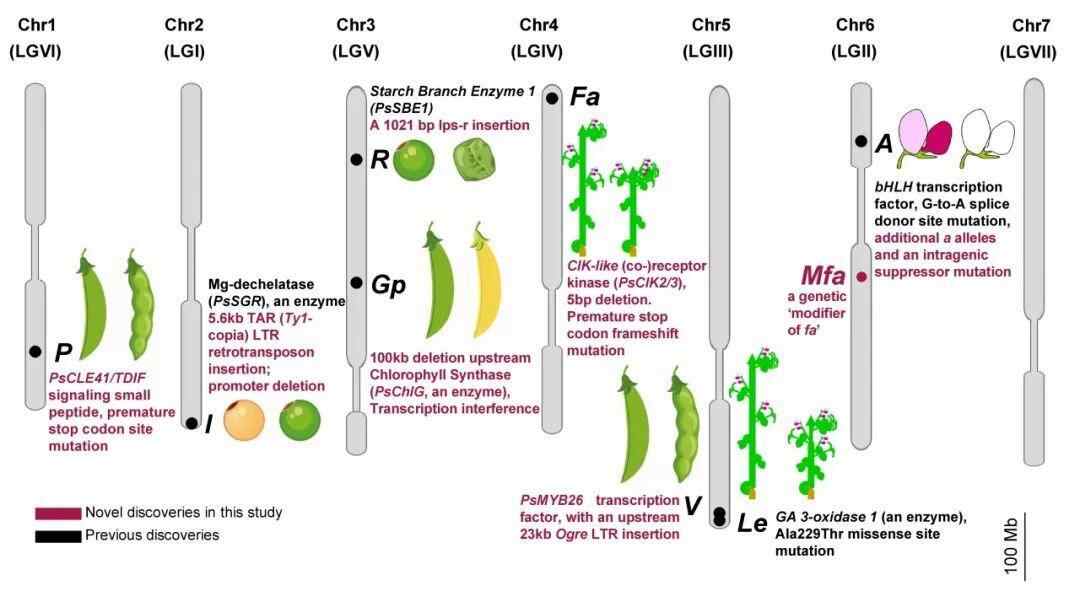 1865年,孟德尔通过豌豆7对相对性状(种子圆皱、子叶颜色、花色、花的位置、果荚形态、果荚颜色和株高)的杂交实验,首次提出“遗传因子”控制性状的理论,并推导出遗传变异在世代间传递的独立分离和自由组合规律。受限于当时时代背景和技术条件,他未能揭示这些因子的分子本质。后续研究历经一个多世纪,科学家们陆续克隆了控制种子圆皱、株高、子叶颜色和花色的基因,但控制果荚颜色、果荚形态和花的位置的关键基因至今仍是遗传学的未解之谜。