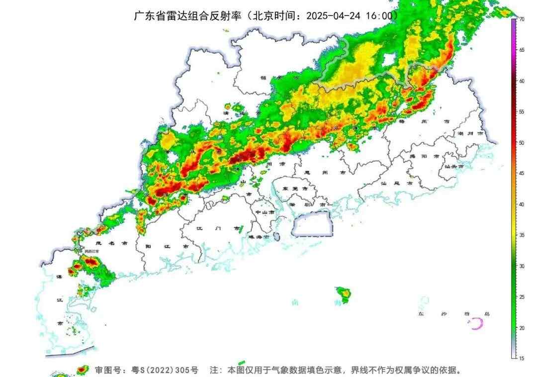 4月24日16时,广东气象雷达图拼图,显示有飑线正在南压