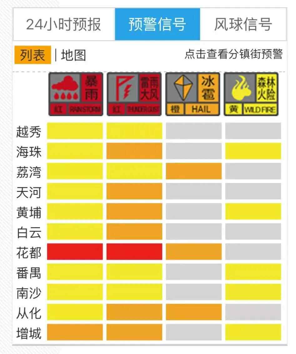 根据广州市气象台监测。一条飑线系统在广州以北生成,并逐渐南压。截至24日16时15分,花都发布了雷雨大风红色、冰雹橙色、暴雨橙色预警信号;从化区发布了雷雨大风橙色、冰雹橙色、暴雨黄色预警;增城区和白云区发布了雷雨大风橙色、暴雨黄色预警;越秀、天河、黄埔、番禺发布暴雨和雷雨大风黄色预警;海珠、荔湾发布雷雨大风黄色预警信号。由于风雨正在发展,不排除其他行政区后续继续发布或调整预警信号,请市民做好防御。