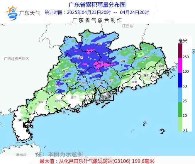 4月23日20时至24日20时,广东全省有36个镇街录得超过100毫米的大暴雨,各市雨量较大的镇街包括广州市从化区吕田镇199.6毫米、清远市英德市横石塘镇180.4毫米、惠州市龙门县地派镇160.3毫米、韶关市新丰县沙田镇127毫米、河源市东源县锡场镇124.1毫米。