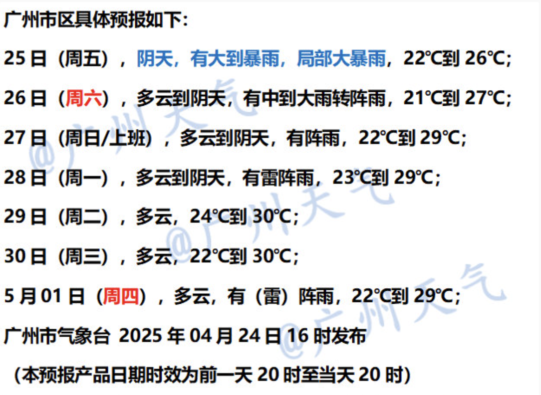 展望4月27日至4月30日,广州逐渐转为多云为主,5月1日至3日多云,有雷阵雨。
