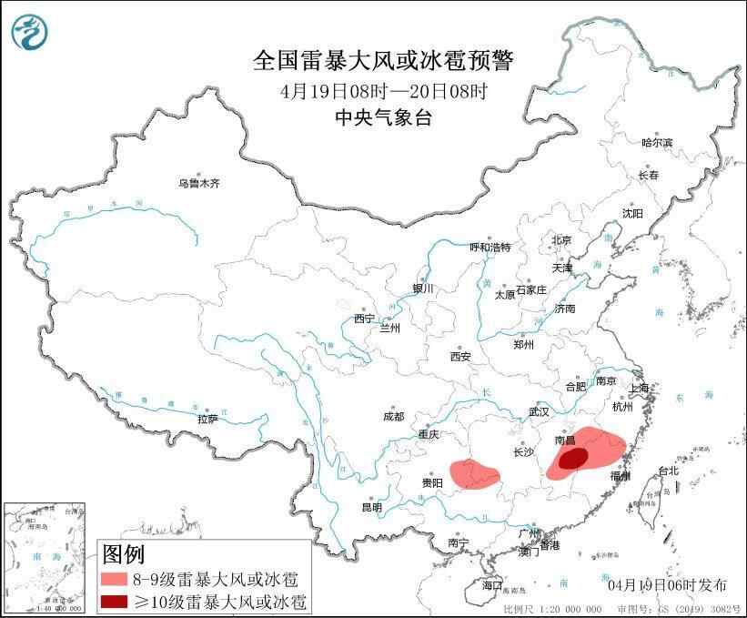 预计4月19日08时至20日08时,西南地区东南部、江南西南部和中东部等地的部分地区将有8级以上雷暴大风或冰雹天气,其中,江西中南部、福建西北部等地的部分地区将有10级以上雷暴大风,最大风力可达11级;西南地区东南部、江南、华南北部等地的部分地区将有小时雨量大于20毫米的短时强降水天气,其中,贵州东南部、湖南中南部、江西中南部、福建西北部、广西东北部、广东西北部等地的部分地区小时雨量大于50毫米,最大可达70毫米以上。