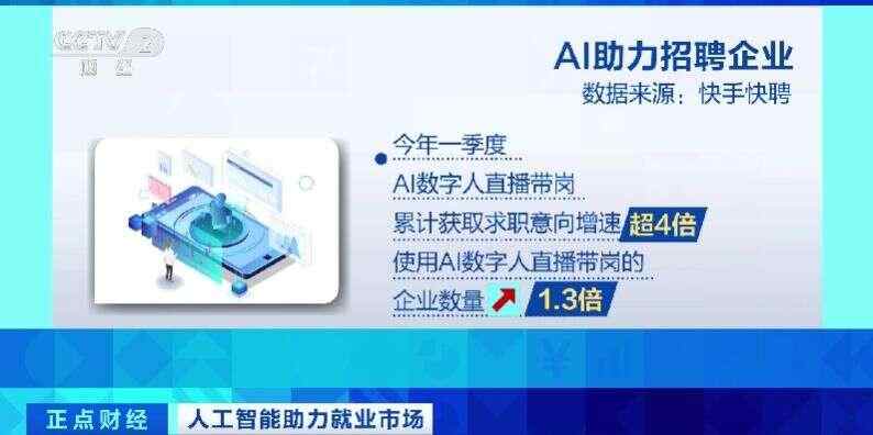 调研显示,今年春招近50%的招聘企业,通过AI面试等方式进行招聘;19%的招聘企业正在部署AI大模型,以用于简历筛选、面试等场景。今年一季度,AI数字人直播带岗累计获取求职意向增速超4倍,使用AI数字人直播带岗的企业数量增长了1.3倍。