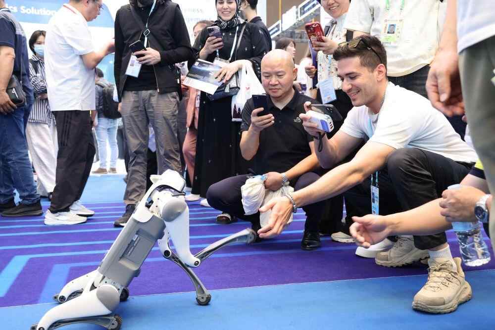 首次设立的服务机器人专区成为本届广交会上的亮点,共吸引相关优质企业46家参展。许多境外采购商高举手机,拍摄机器狗、工业外骨骼装备、自动巡航机器人、咖啡机器人等画面,不时发出惊叹。