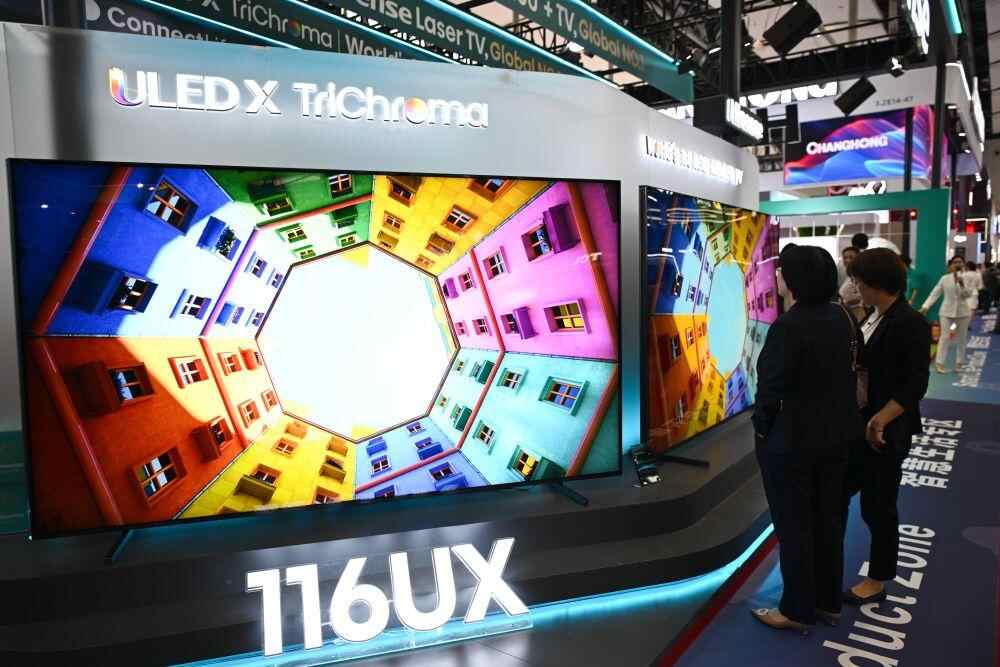 4月16日,在第137届广交会的智慧生活专区,观众观看大尺寸电视产品。新华社记者 邓华 摄