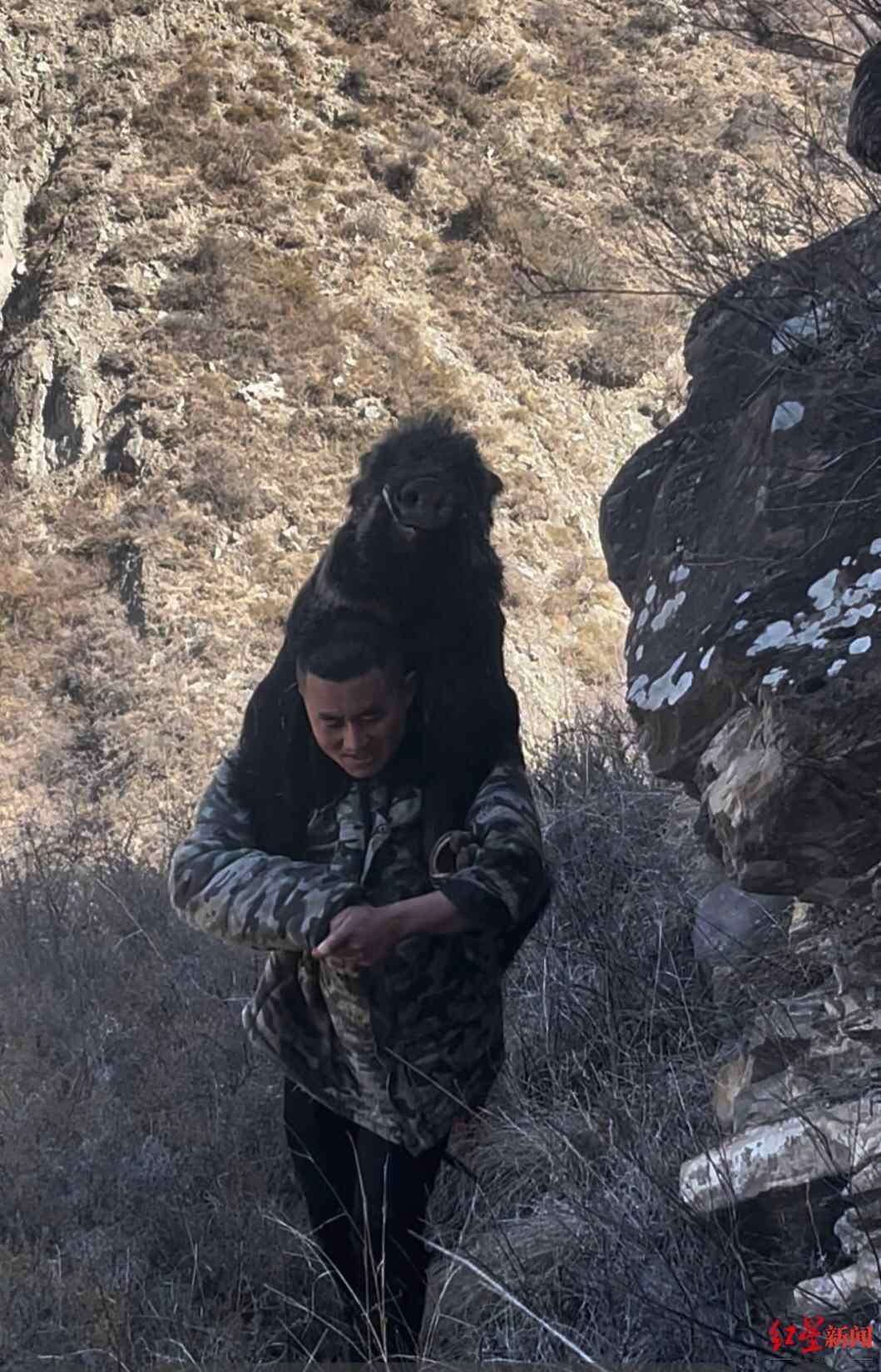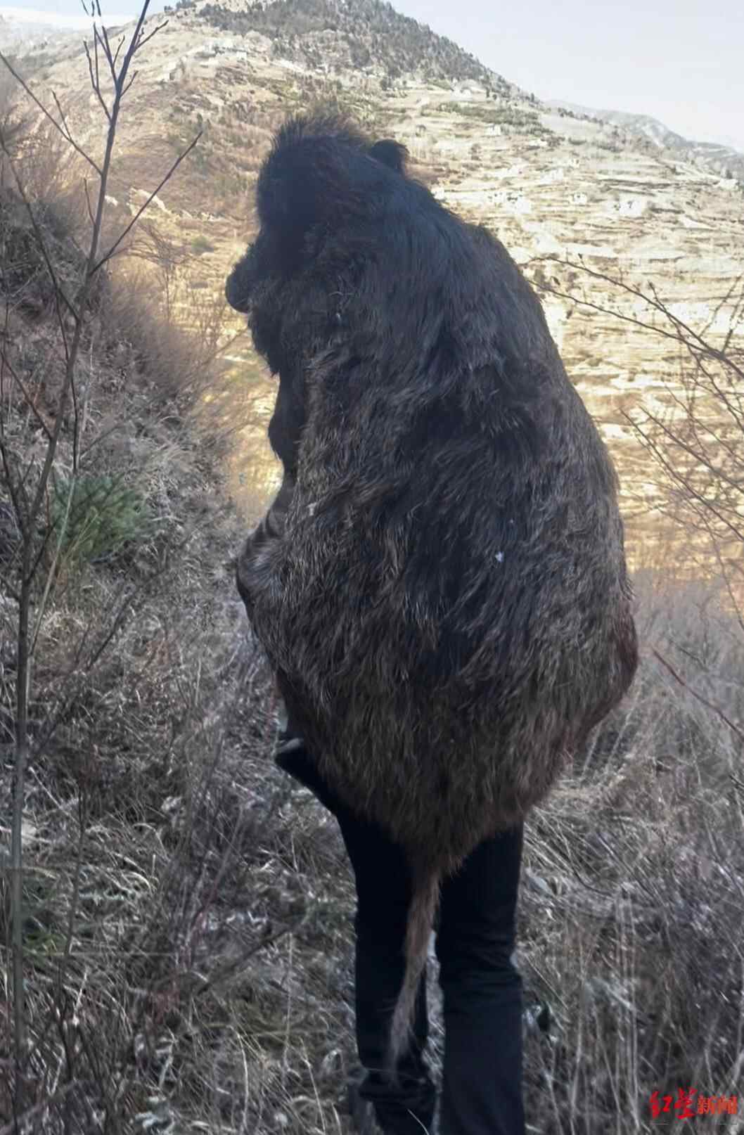 “打死野猪只用了几分钟,但背下山却花了五六个小时。”刘旺介绍,他们猎杀的这头野猪大约有200斤重,还有很长的獠牙,“丹巴高山峡谷地形复杂,两个人抬着不好走,只能把野猪背下山。”