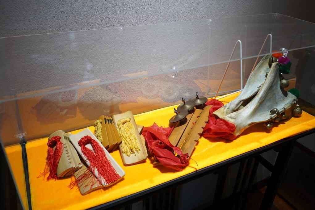 刘亚伟的工作室中展示的快板、“哈拉巴”和“仨拉击”。(新华社发 段宇飞 摄)