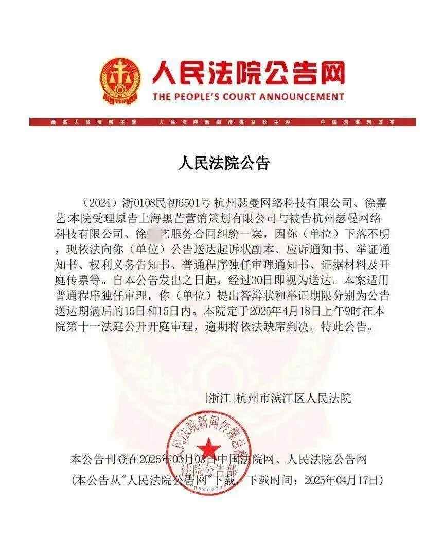 据人民法院公告网刊登的公告显示,杭州市滨江区人民法院受理原告上海黑芒营销策划有限公司与被告杭州瑟曼网络科技有限公司、徐某艺服务合同纠纷一案。送达内容包括起诉状副本、应诉通知书、举证通知书、权利义务告知书、普通程序独任审理通知书、证据材料及开庭传票等,定于4月18日9时在杭州市滨江区人民法院第十一法庭公开开庭审理。