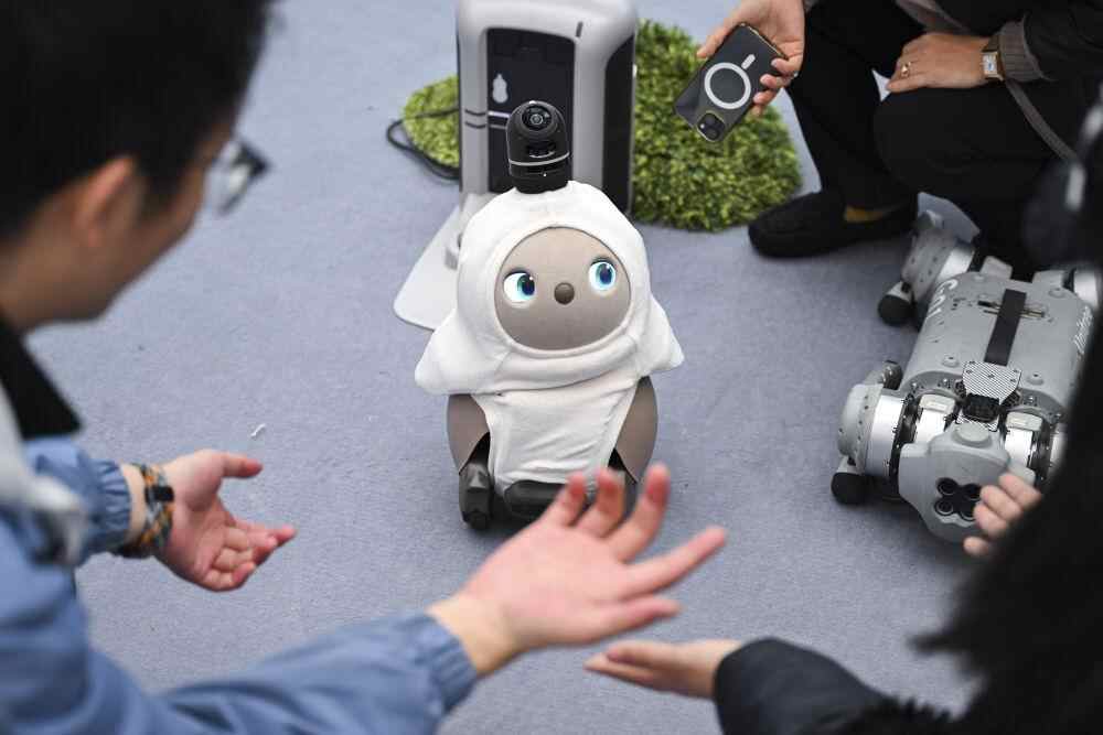 2月21日,观众在上海举行的2025全球开发者先锋大会现场与陪伴机器人互动。新华社发(陈浩明 摄)