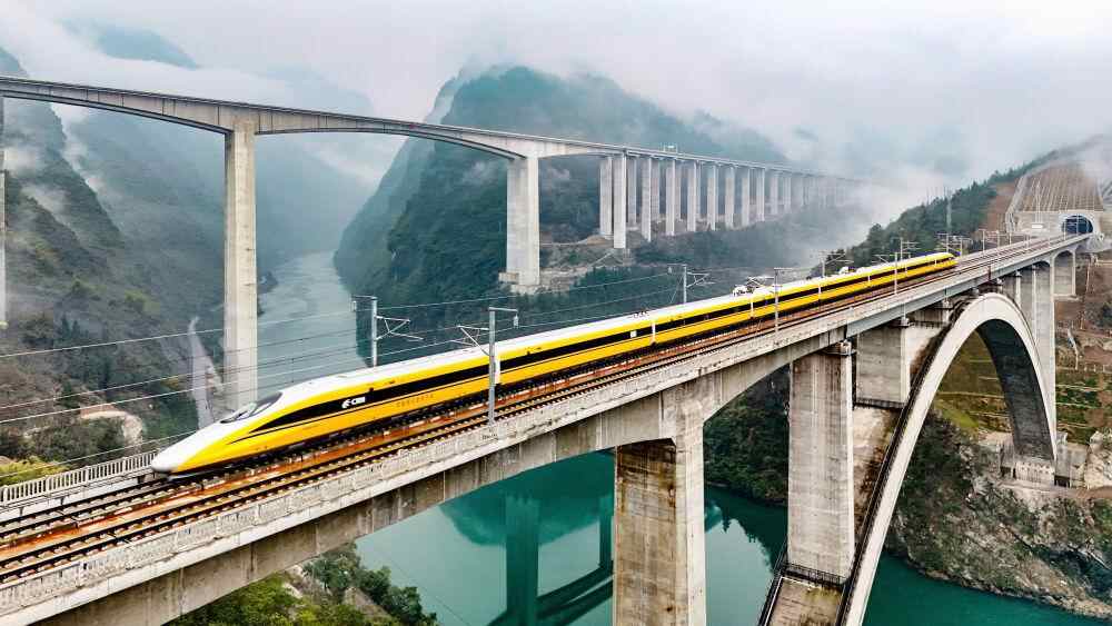 3月13日,高速综合检测列车行驶在渝厦高铁重庆段(无人机照片)。 新华社发(黄继吉 摄)