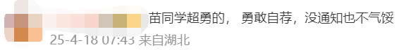 对于苗同学的自荐行为,网友各有各的看法。有网友称赞他是“硬核求职天花板”,觉得年轻人就该主动出击,毕竟“等,全是问题,做,才有答案”。这种积极主动争取机会的态度,在当下竞争激烈的就业市场中难能可贵。