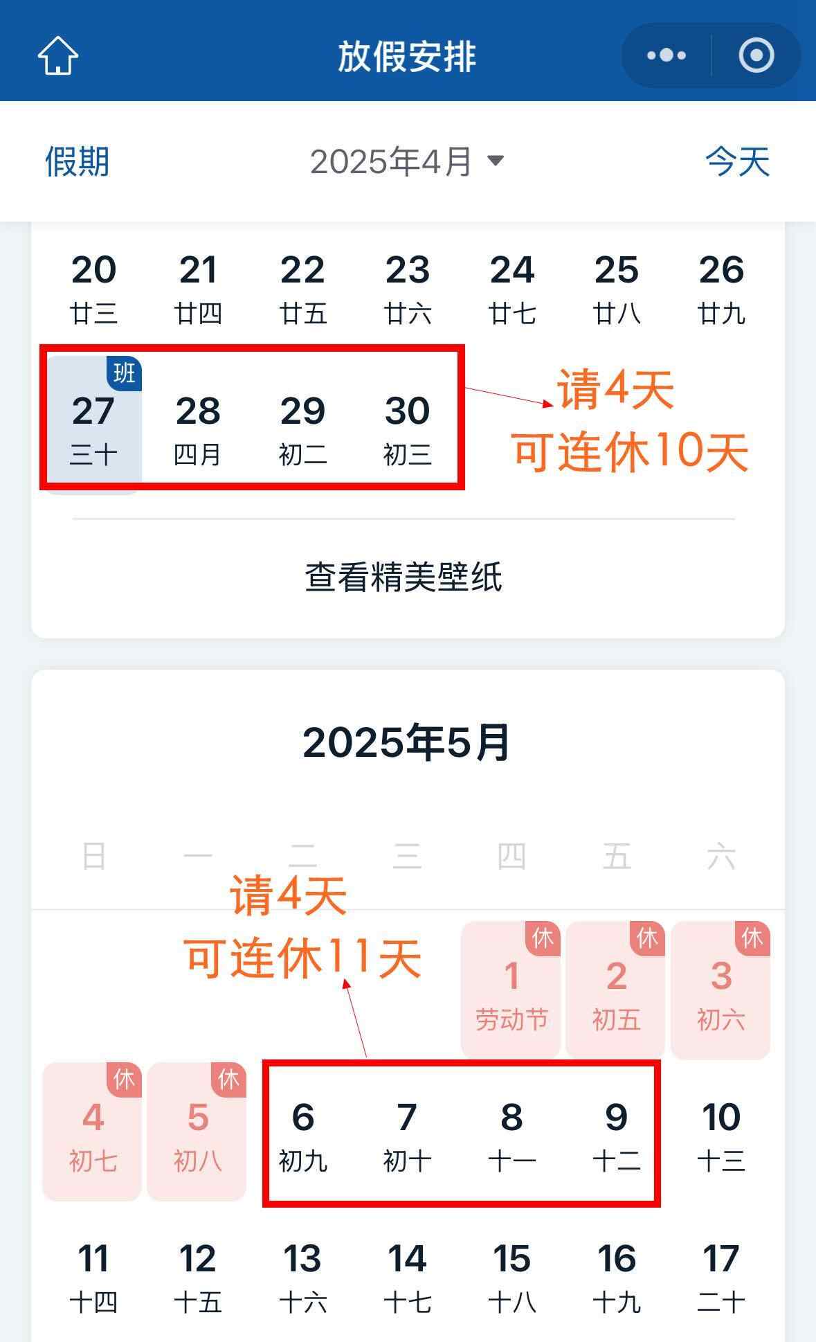 结合假期安排,若在4月27日至4月30日请假,可连休10天;若在5月6日至5月9日请假4天,可连休11天。
