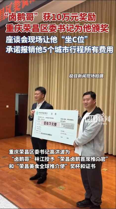 4月10日,荣昌区美食之城建设暨网络达人交流座谈会召开。高洪波向“卤鹅哥”颁发“荣昌卤鹅首席推介官”“最美家乡推荐官”“荣昌美食全球推荐大使”“荣昌文旅全球推荐大使”“网络正能量传播先锋”奖杯和证书,并代表区委区政府向其奖励10万元。另外“五城投喂”费用全部报销。