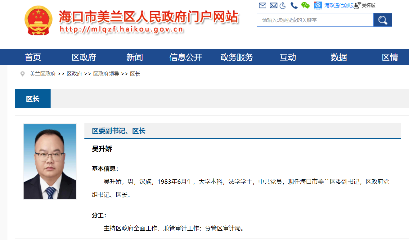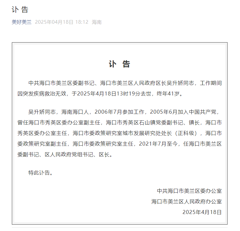 4月18日,海南省海口市美兰区委办公室、美兰区政府办公室发布讣告:中共海口市美兰区委副书记、海口市美兰区人民政府区长吴升娇同志,工作期间因突发疾病救治无效,于2025年4月18日13时19分去世,终年41岁。