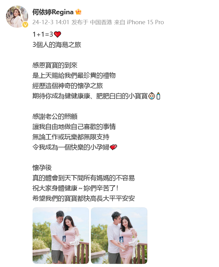何依婷晒出孕肚照写道:“1+1=3,3个人的海岛之旅。感恩宝宝的到来,是上天赐给我们最珍贵的礼物,经历这个神奇的怀孕之旅,期待你成为健健康康、肥肥白白的小宝宝。感谢老公的照顾,让我自由地做自己喜欢的事情,无论工作或玩乐都无限支持,令我成为一个快乐的小孕妇。”