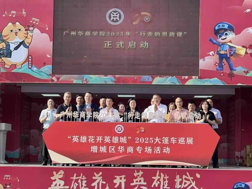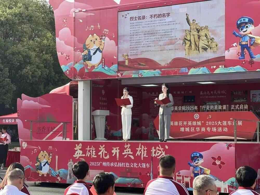 一辆绘有红色木棉花和“书香羊城”标志的大篷车停放在广州华商学院门口,车身展开后宛如一朵火红的木棉花,格外引人注目……4月16日,“英雄花开英雄城”2025广州传承弘扬红色文化大篷车巡展活动增城区专场在广州华商学院举办,活动以大篷车作为流动展馆,通过主题宣讲、诗歌朗诵、歌曲演唱等多元化的节目,打造了一场有深度、有温度、有趣味的英雄故事会和音乐会,当日吸引了500余名师生参加。
