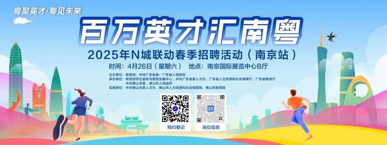 4月20日上午10时,“百万英才汇南粤”2025年N城联动春季招聘活动(南京站)新闻发布会将在南京国际展览中心举办,介绍4月26日南京站招聘活动的特点亮点、岗位信息及人才政策环境等情况,展现佛山乃至广东招才引智的诚意和实力,诚邀南京及全国英才共赴湾区之约。