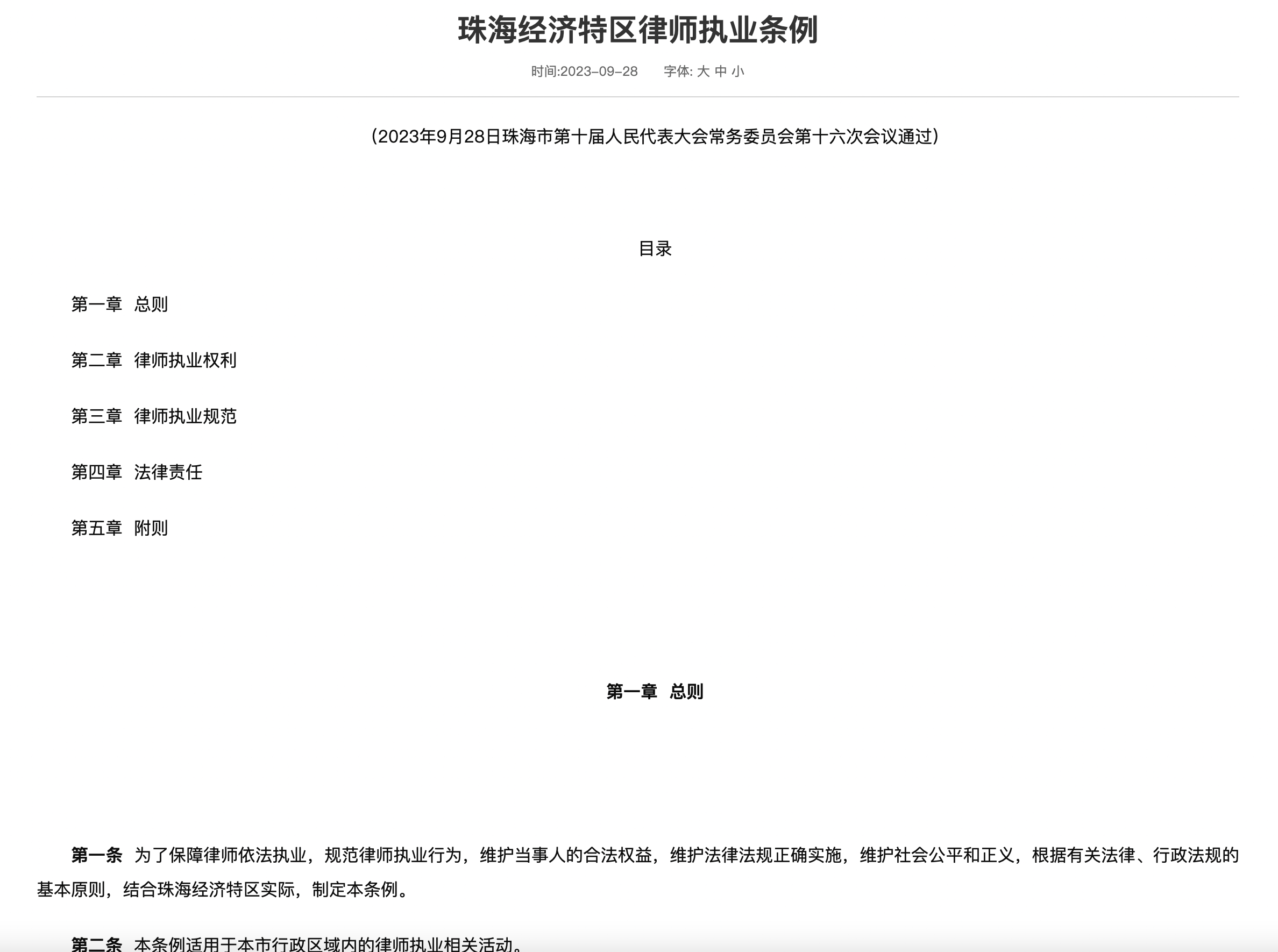 珠海充分发挥特区立法权优势,探索律师执业权利保障机制。在珠海市律协推动下,2023年9月,珠海市人大常委会通过了《珠海经济特区律师执业条例》。该条例运用特区立法权,以问题为导向,重点就珠海市律师执业规范、需求难点、支持粤港澳大湾区律师协同发展等方面进行制度创新。