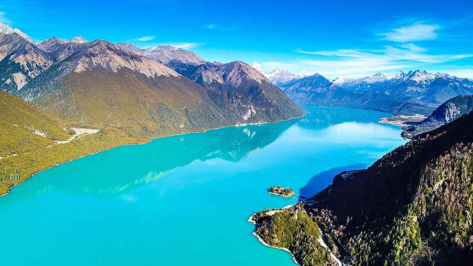 从空中俯瞰巴松措,宛如一颗遗落人间的蓝宝石。湛蓝的湖水在群山环绕间静静铺展,周边的雪山像是忠诚的卫士,山顶的积雪在阳光下闪耀,倒映在湖中,与湖底的幽深交织。湖中的小岛如同绿色的明珠,岛上的植被郁郁葱葱,像是大自然精心雕琢的盆景,在这一片澄澈的湖面上,书写着属于巴松措的宁静画卷。