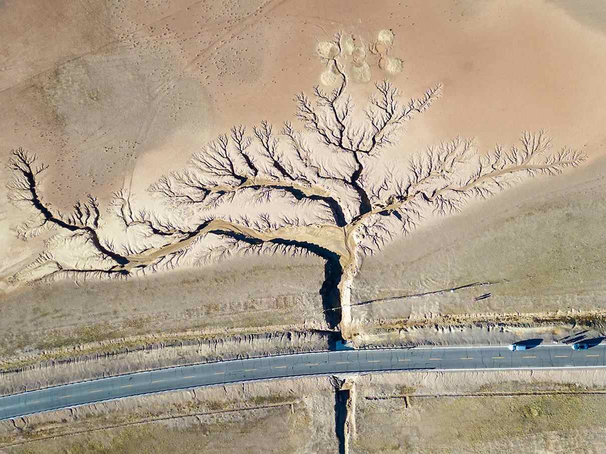 在西藏自治区那曲市尼玛县达则措南的荒芜高原上,从空中俯瞰高原的荒凉之美,干涸河床的纹理如大地之树,枝干分明延伸至国道317线旁。公路横贯荒原,干裂的河床仿佛凝固的时间,诉说着高原的生命印记。