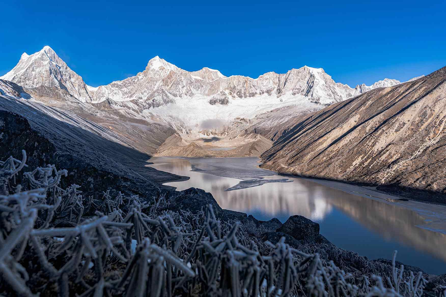 库拉岗日的壮美尽收眼底,雪山巍峨耸立,湖水如镜倒映着雪山的倒影,天地间仿佛凝固了时间。山峦起伏,山川褶皱如大地的脉络,诉说着岁月的沧桑。这幅画卷将自然的雄浑与宁静完美融合,令人心驰神往。