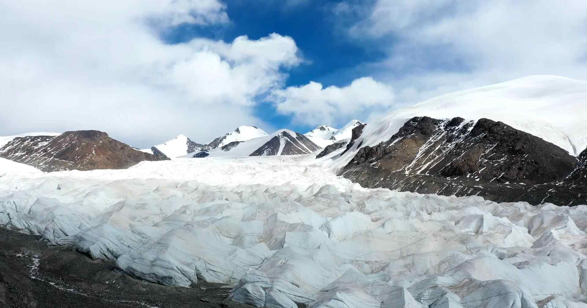 这张图片展现了格拉丹东冰川的壮丽景象。远处的雪山巍峨耸立,覆盖着厚厚的积雪,与澄澈的蓝天相接。近处的冰川褶皱如凝固的波涛,洁白的冰面在阳光下泛着微光,云层翻涌其间,增添了几分神秘与宁静。整个画面既有雄浑的气势,又不失纯净之美,仿佛大自然的鬼斧神工。