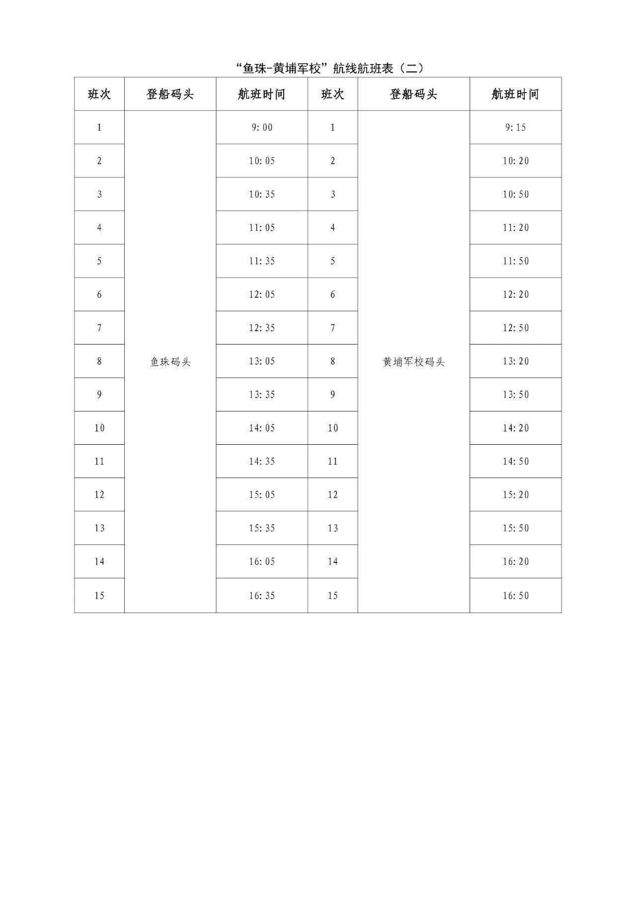 (二)营运时间:鱼珠码头9:00-16:35;黄埔军校码头9:15-16:50;航班班次见航班时间表。