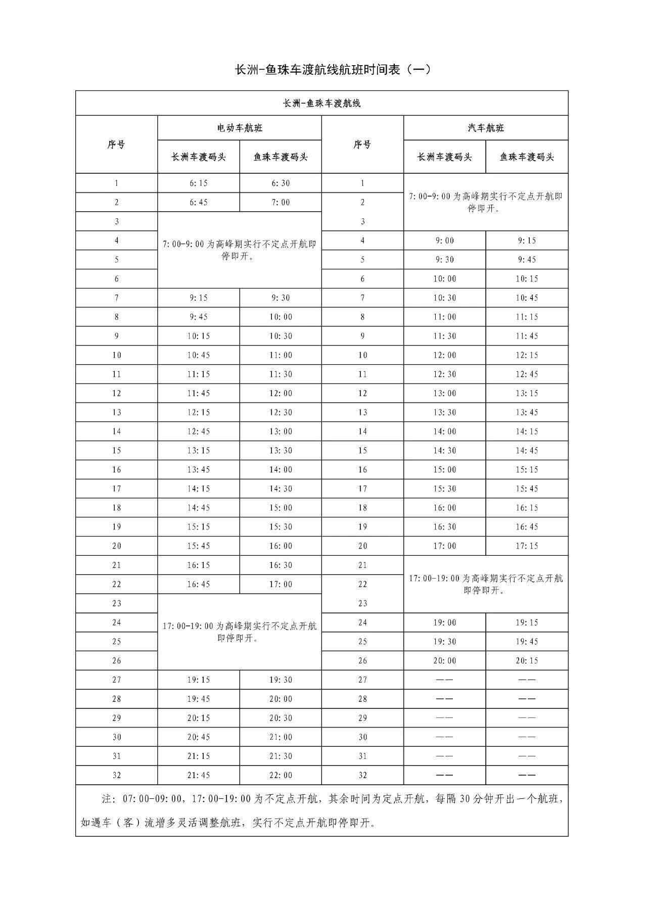 (二)营运时间:长洲车渡码头6:15-21:45;鱼珠车渡码头6:30-22:00;航班班次见航班时间表。