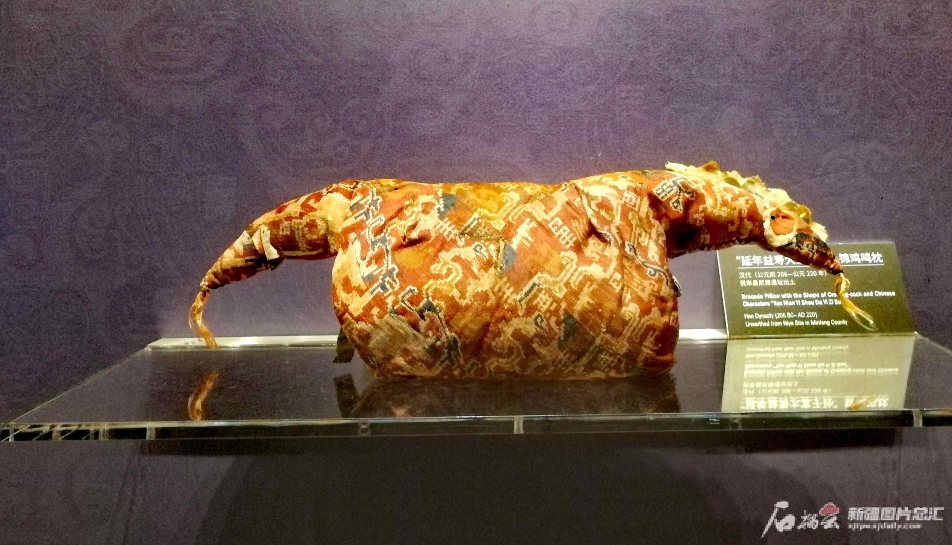 这件馆藏于新疆博物馆的文物出土于尼雅遗址的东汉墓葬。长50厘米,宽13.5厘米,高9厘米,由一块“延年益寿大宜子孙”文字锦缝缀而成,中间是鸡身,两端作鸡首相背状,白绢为底、叠放三层圆形红绢片缝制出了圆眼,天青和白两种绢剪出锯齿形的鸡冠。枕芯是植物茎秆。